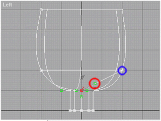 | Now we are going to smooth some of the vertices. Apply an Edit Spine modifier after the CrossSection modifier. From the Left view select the vertices marked in red on the image on the right. Now we are going to change the these vertices to smooth vertices versuses corners. Right click and hold down on one of the selected vertices. A popup list should appear and select the smooth option. |